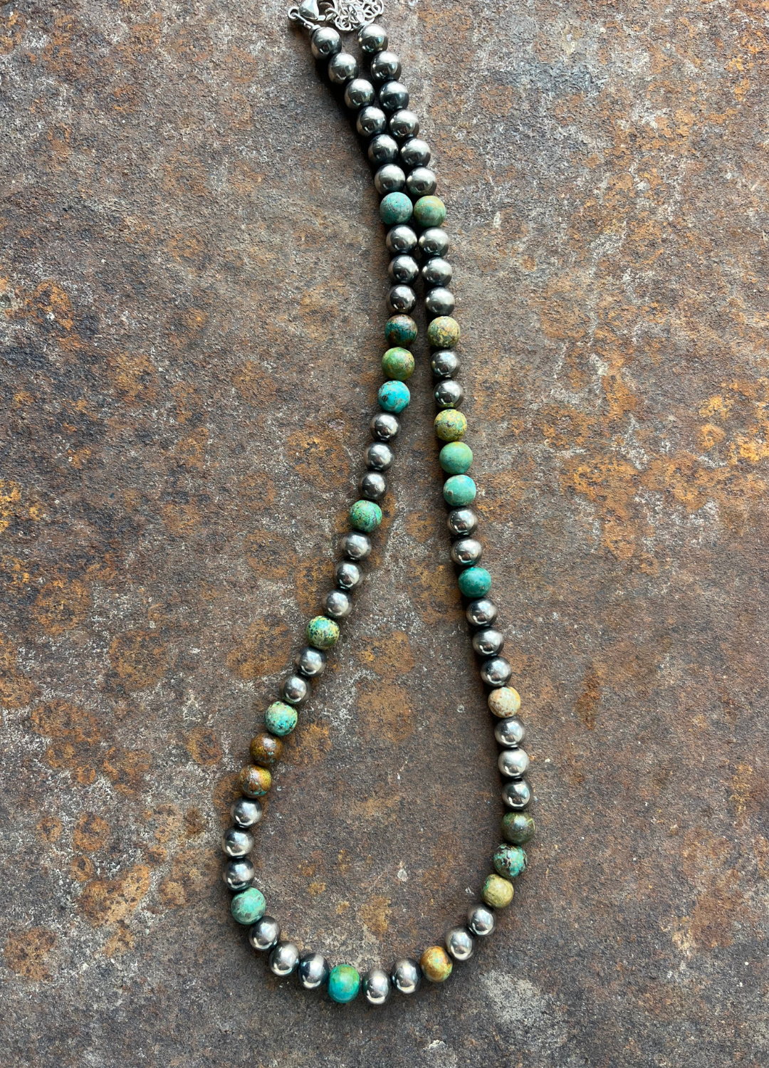 Stunning round turquoise beads accented with 8mm Navajo Pearls. 21” with 2” extender.