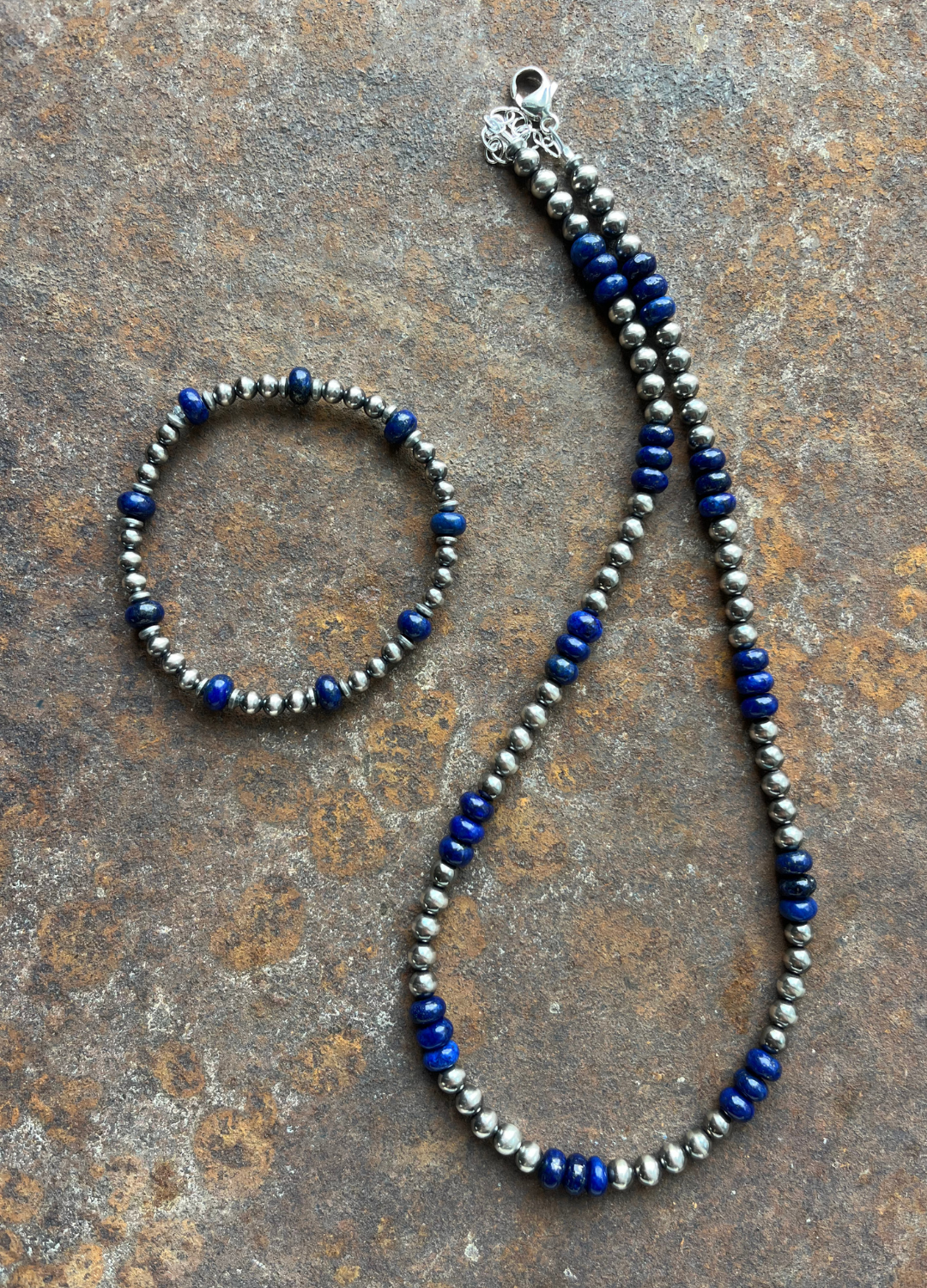 The Blue Lapis bracelet has 4mm navajo pearls and blue lapis for a stunning combination. 7" stretch bracelet to fit all wrists.