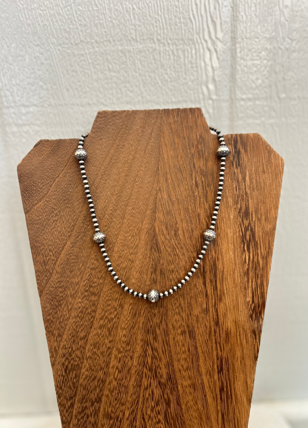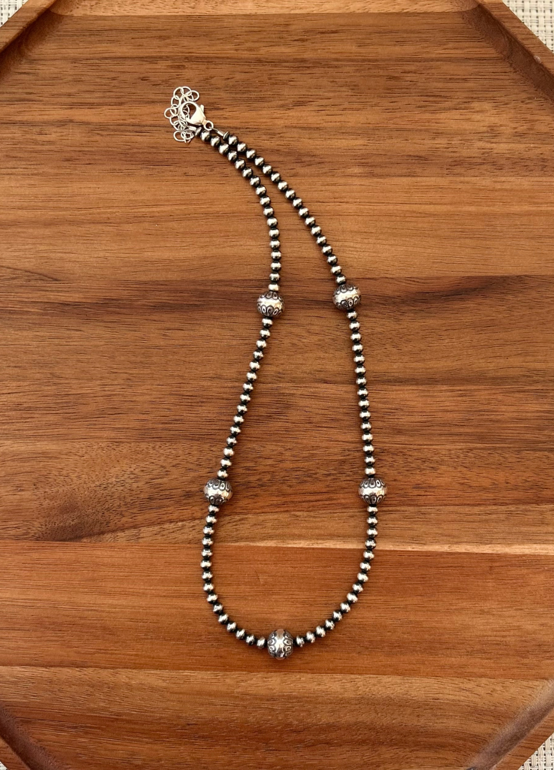 The details in this one are stunning, flower stamped Navajo Pearls surrounded by 4mm Navajo Pearls. 16” with 2” extender.