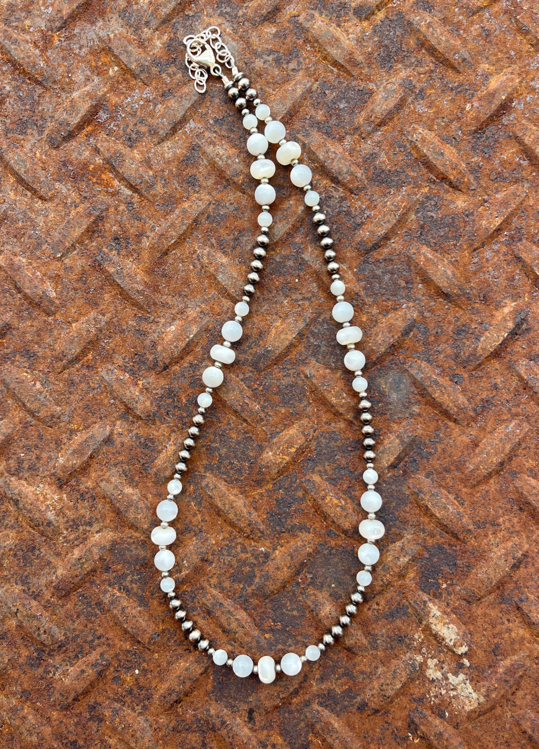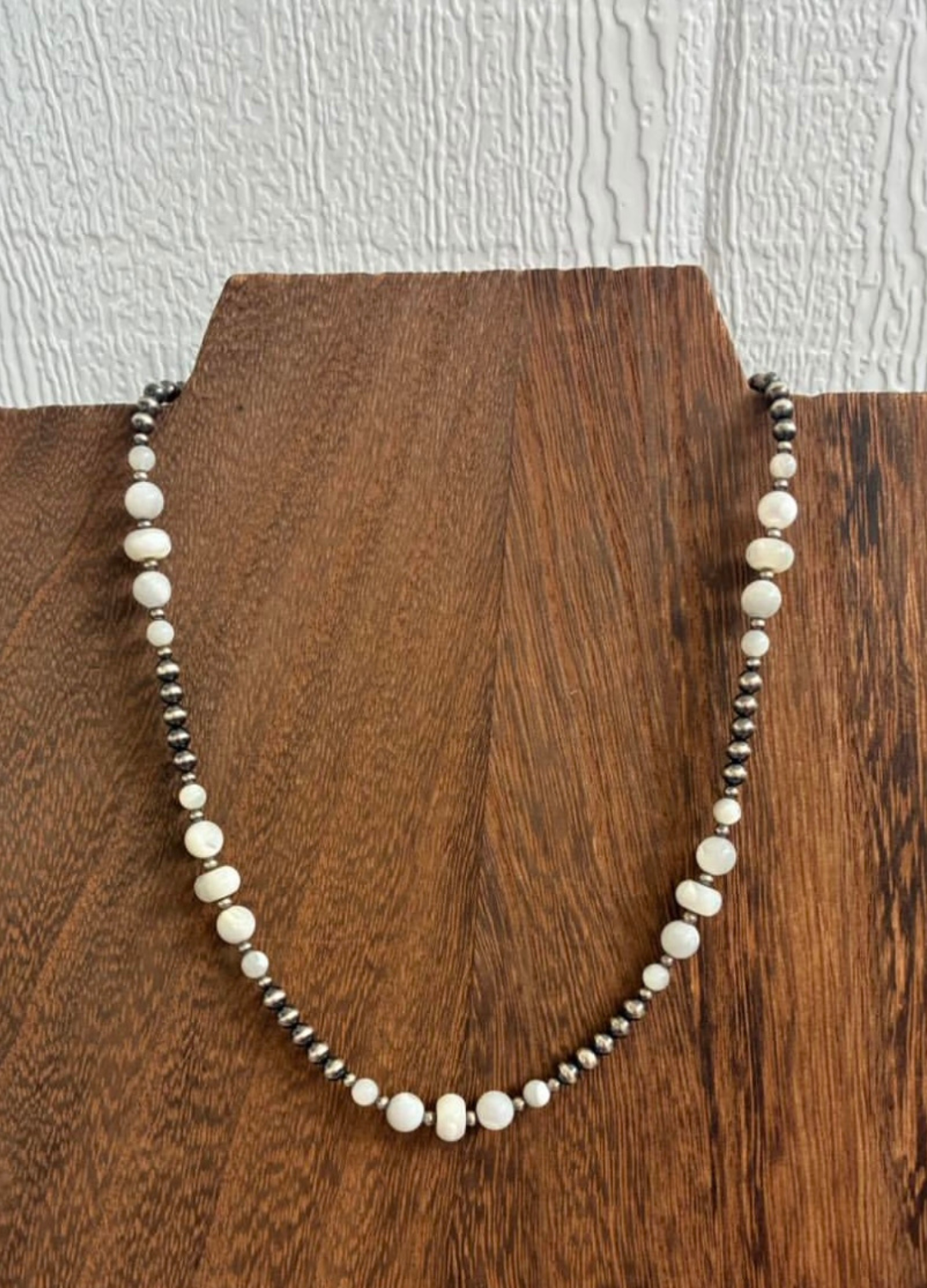 4mm and 2mm navajo pearls paired with 4mm, 6mm, and 8mm Mother of Pearl. 16" with a 2" extender