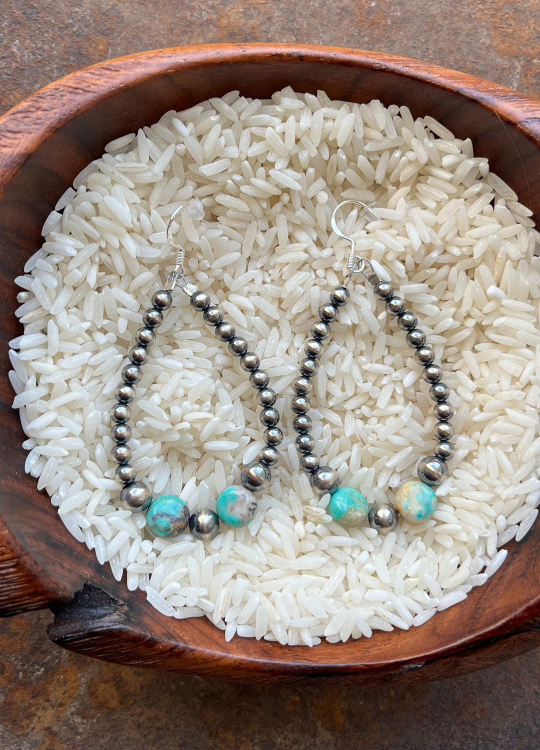 4mm and 6mm navajo pearls paired with stunning turquoise for the perfect set of earrings! Hangs at 2.5"