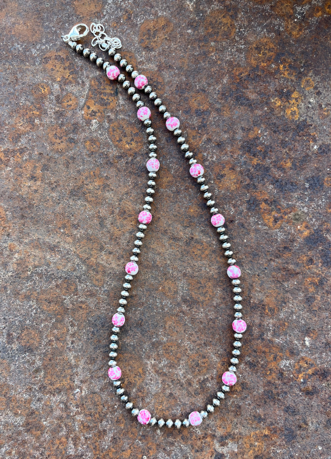 Pink and white porcelain flower beads paired with 4mm navajo pearls make the perfect necklace for our fun gals! 16" with 2" extender