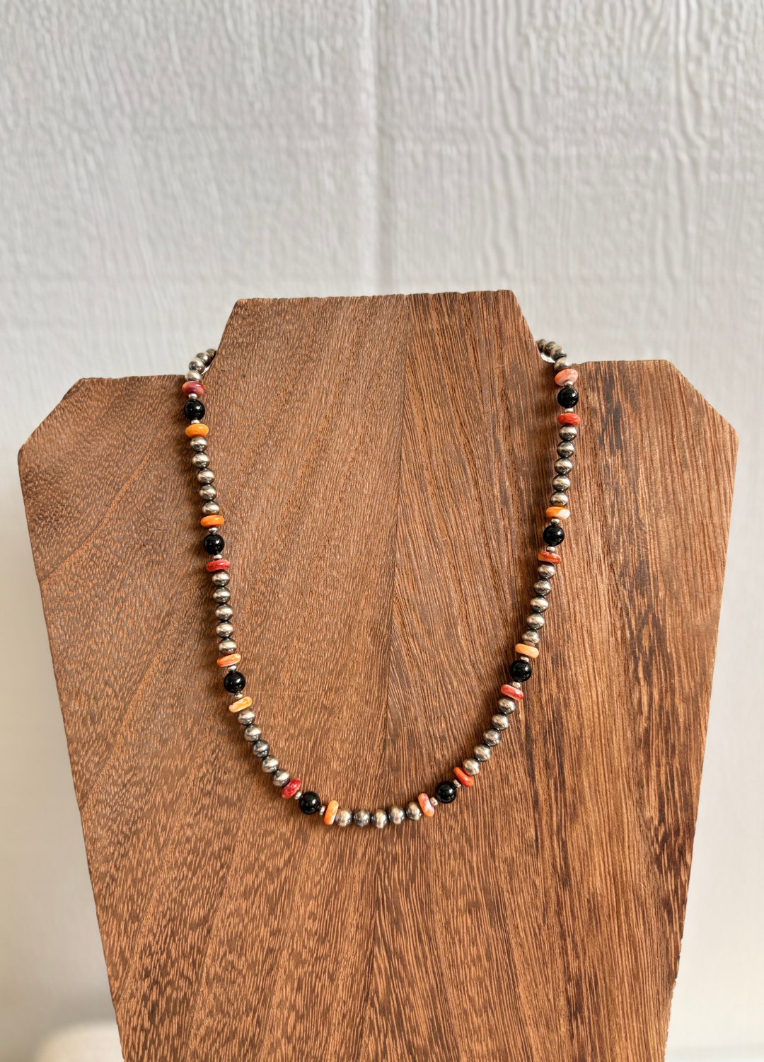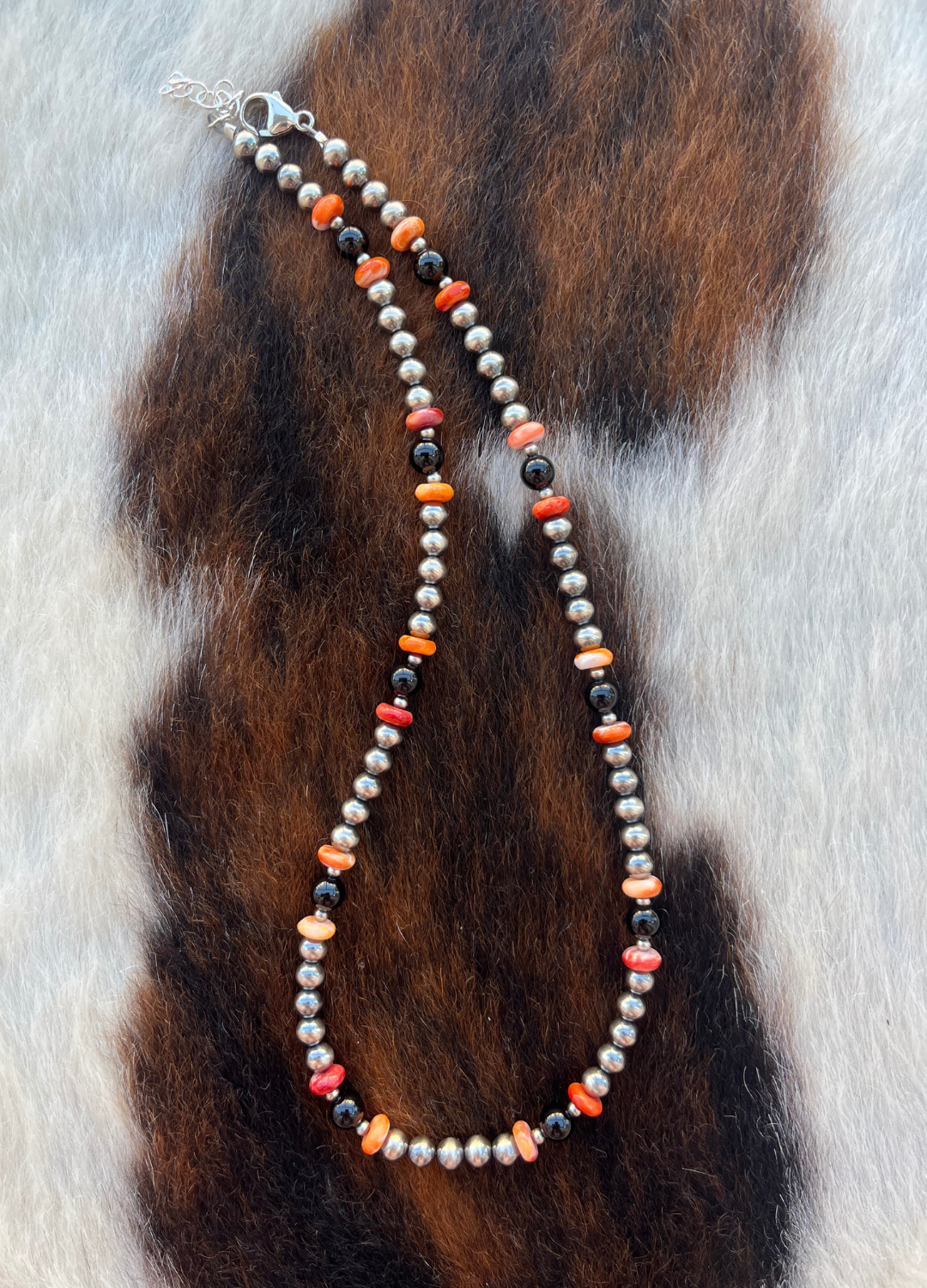 OSU girlies, this one is for you. Orange Spiny beads paired with black onyx beads accented with 3mm and 5mm Navajo Pearls. 16” with 2” extender.