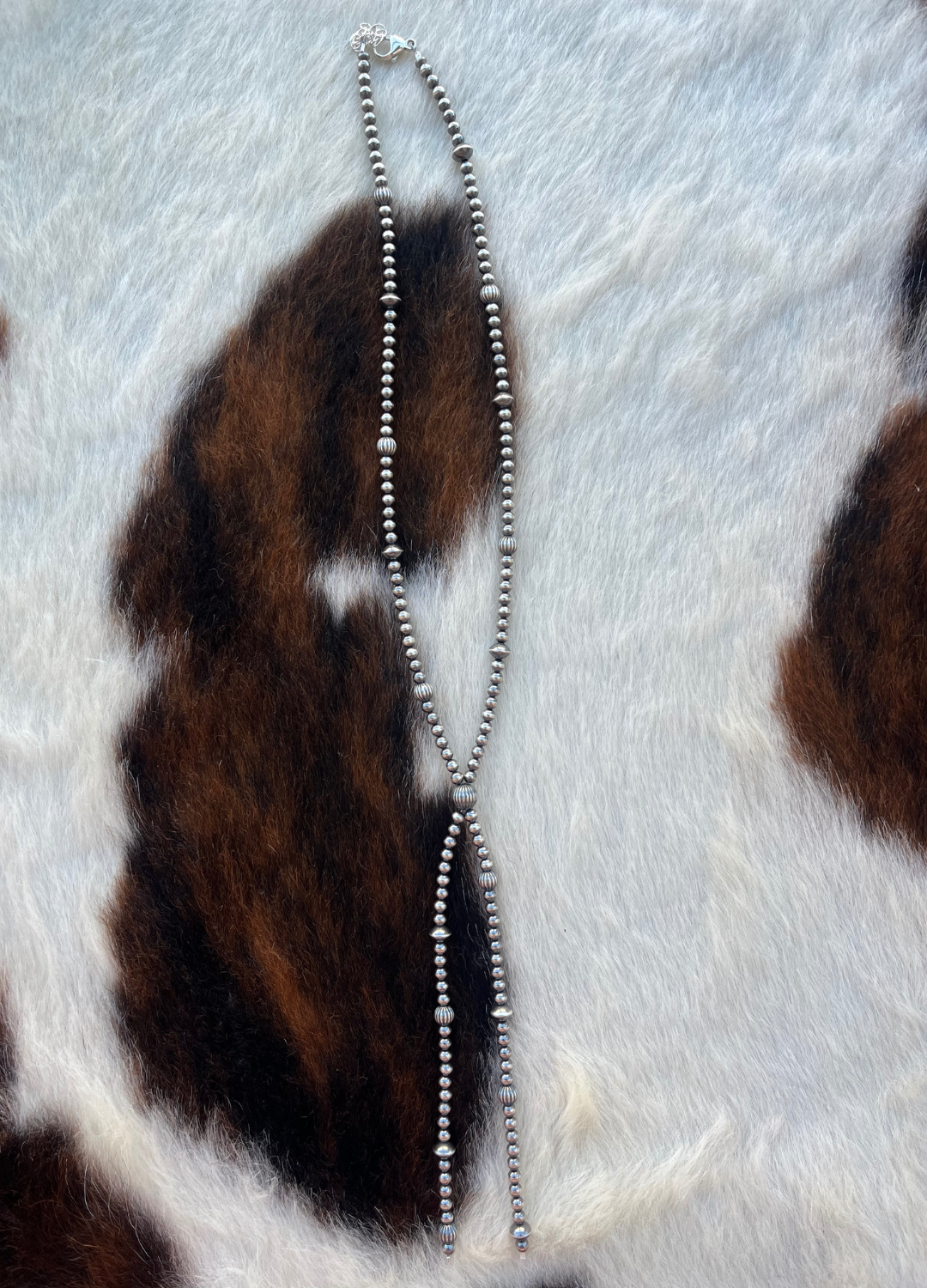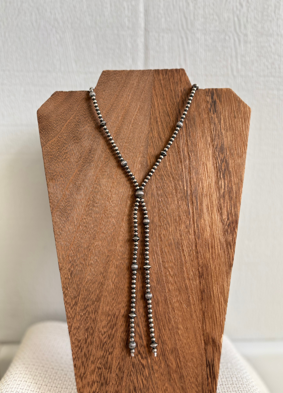 She’s so fun and adds so much texture! A fun combo of 6mm Corrugated and saucer Navajo Pearls, paired with 4mm Navajo Pearls. 18” with 5” drop with 2” extender.