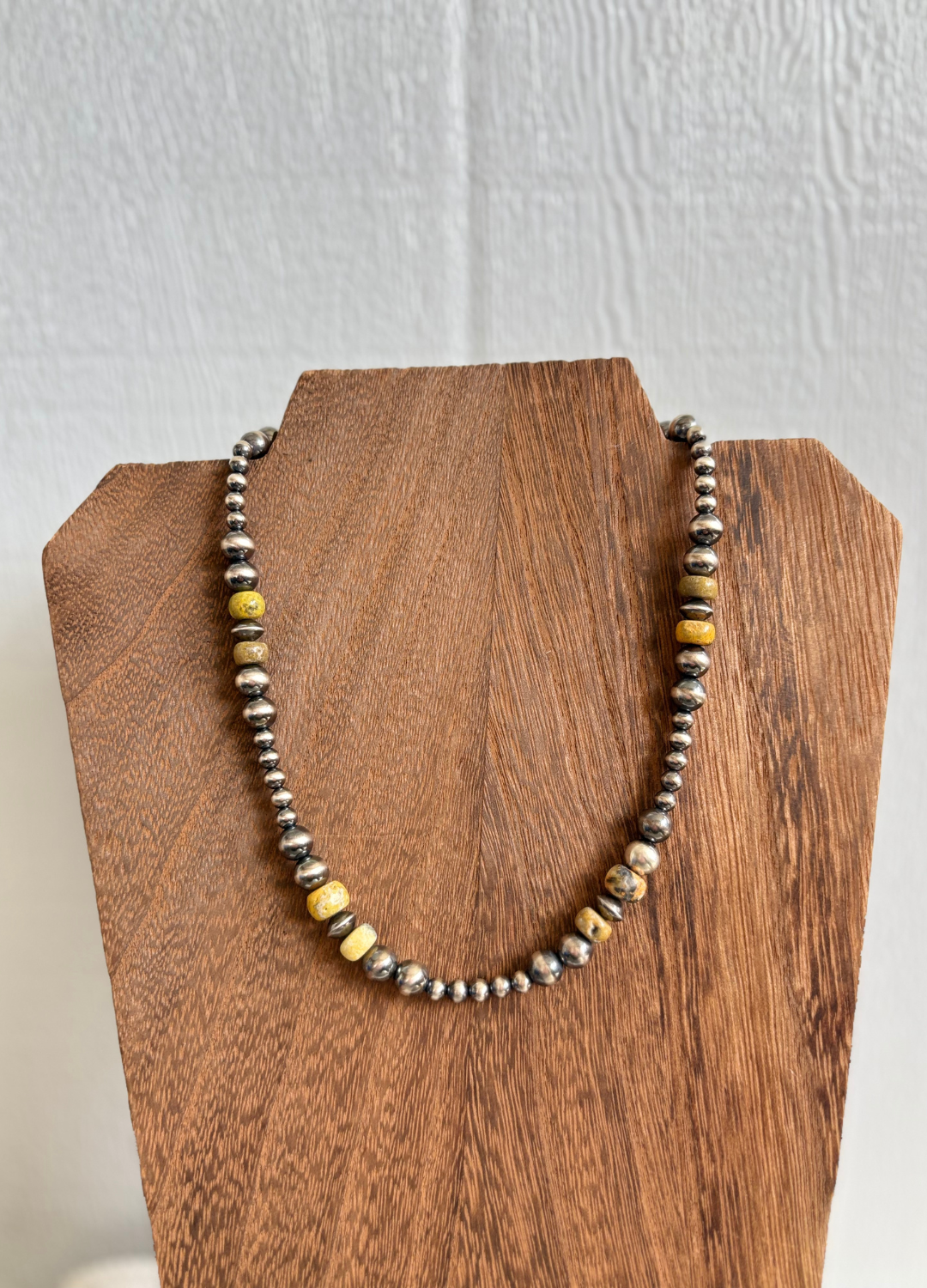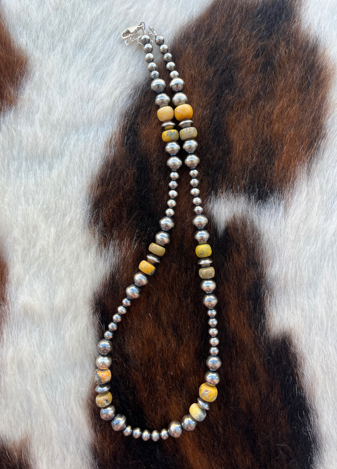 Bumble Bee jasper is in for fall, paired with 5mm, 10mm and 8mm saucer Navajo Pearls. 18” with 2” extender.