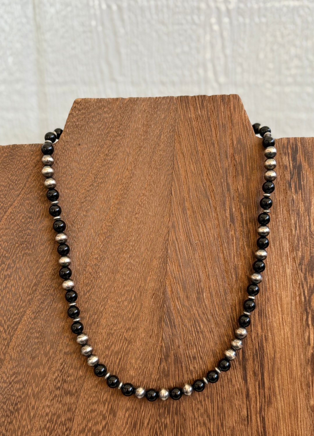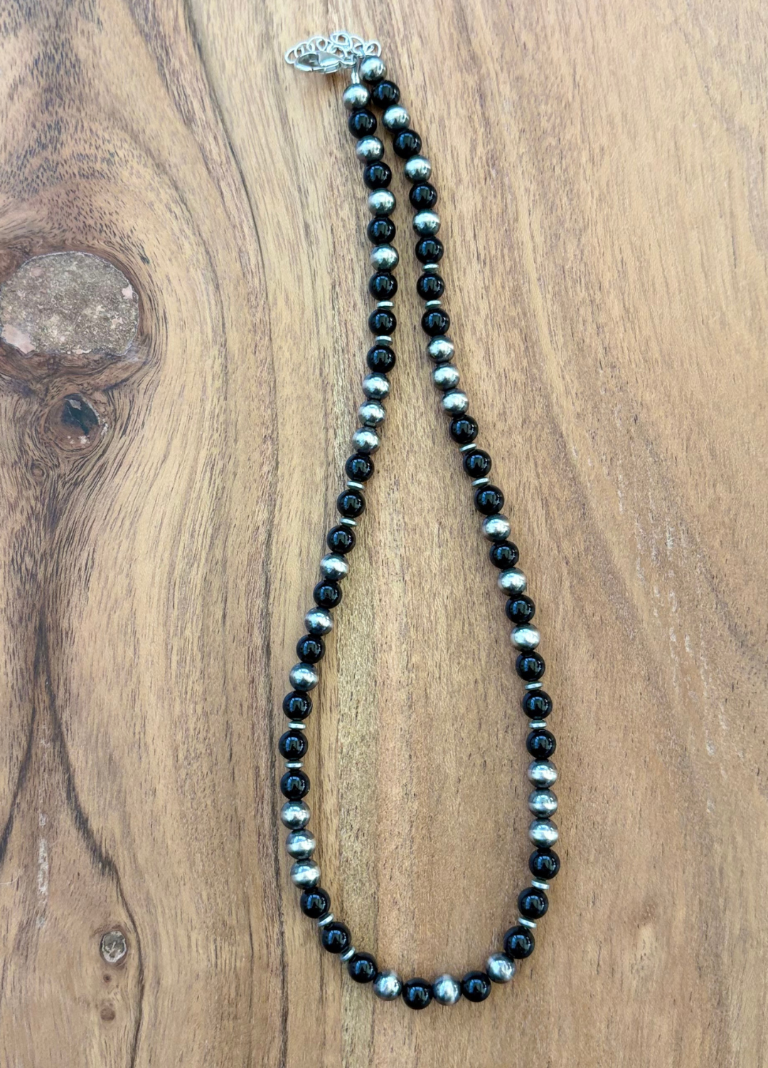 6mm Black Onyx paired with 6mm navajo pearls. 16" with a 2" extender