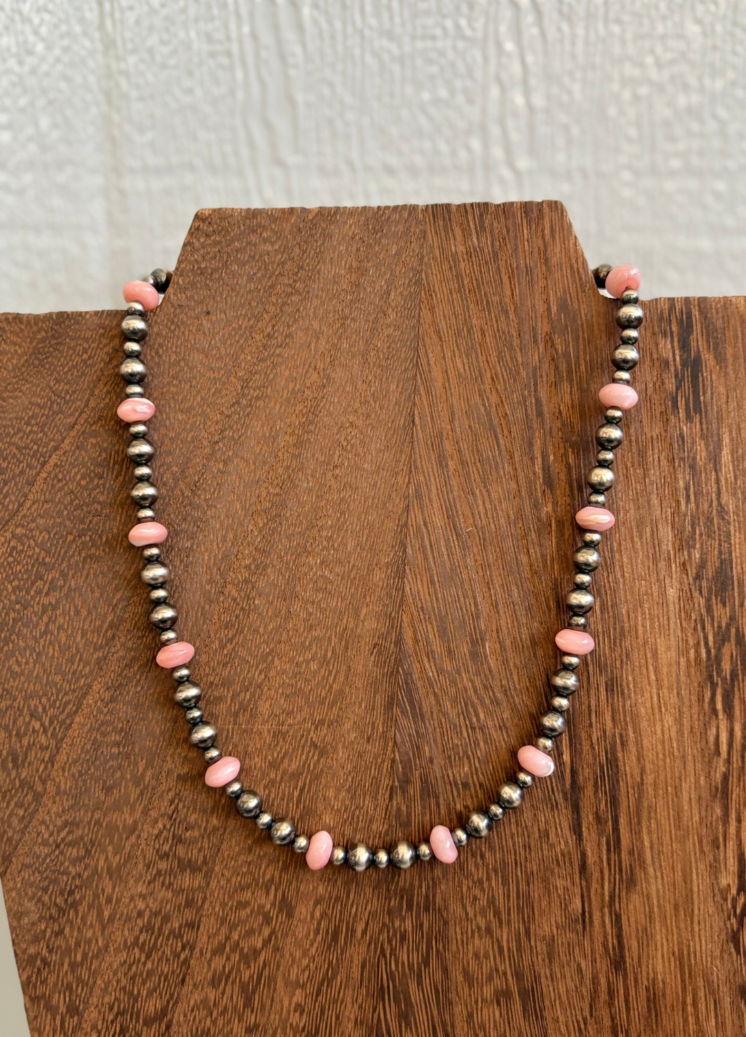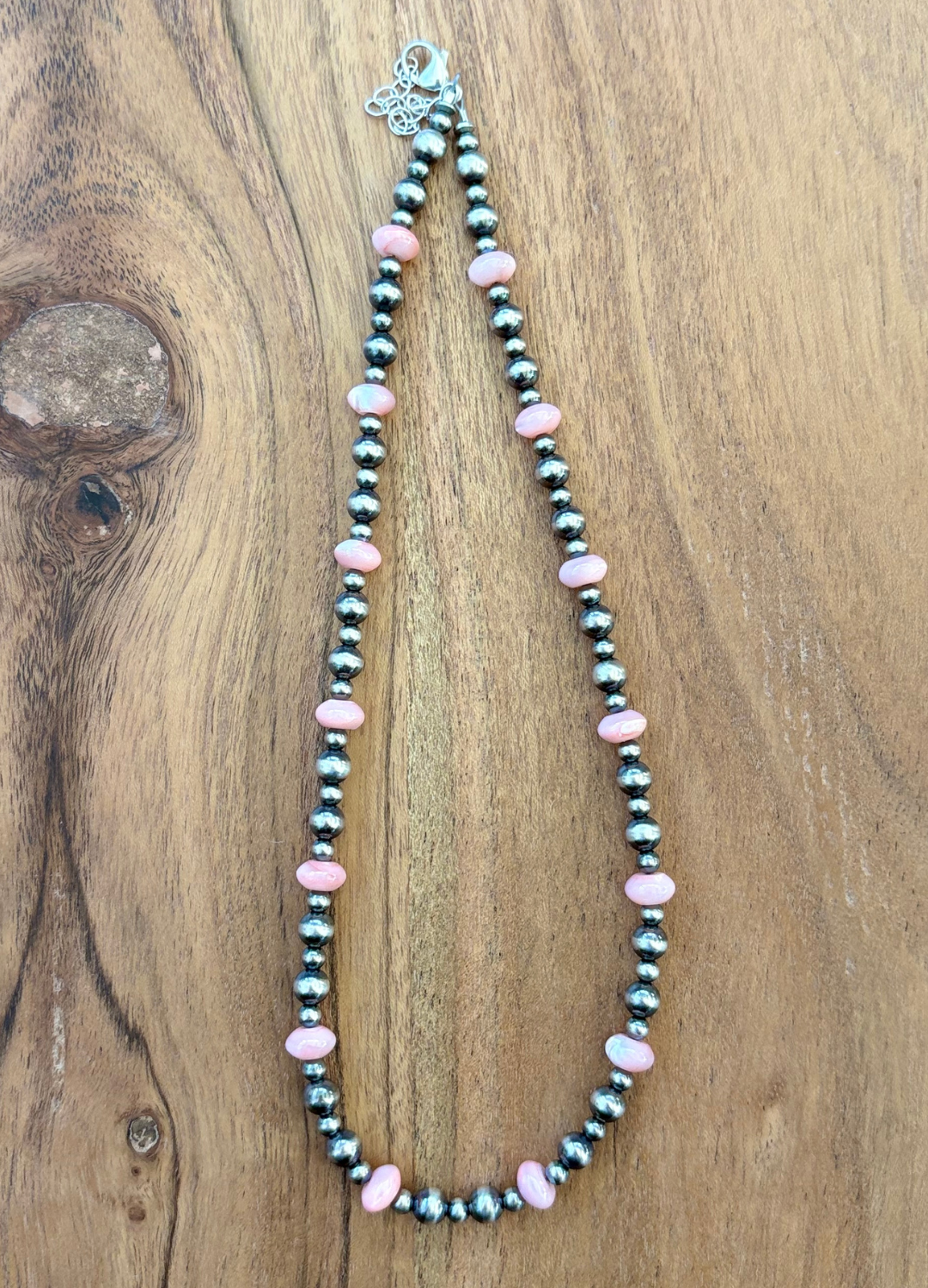 Pink Mother of Pearl paired with 4mm and 6mm navajo pearls. 16" with a 2" extender