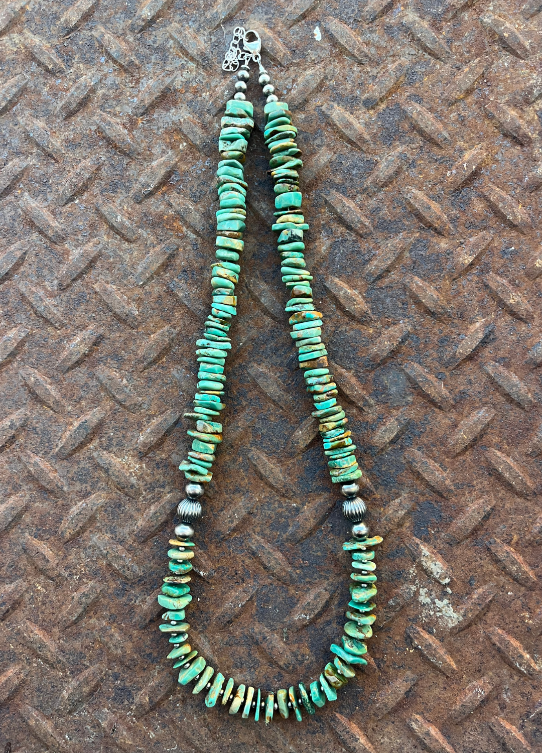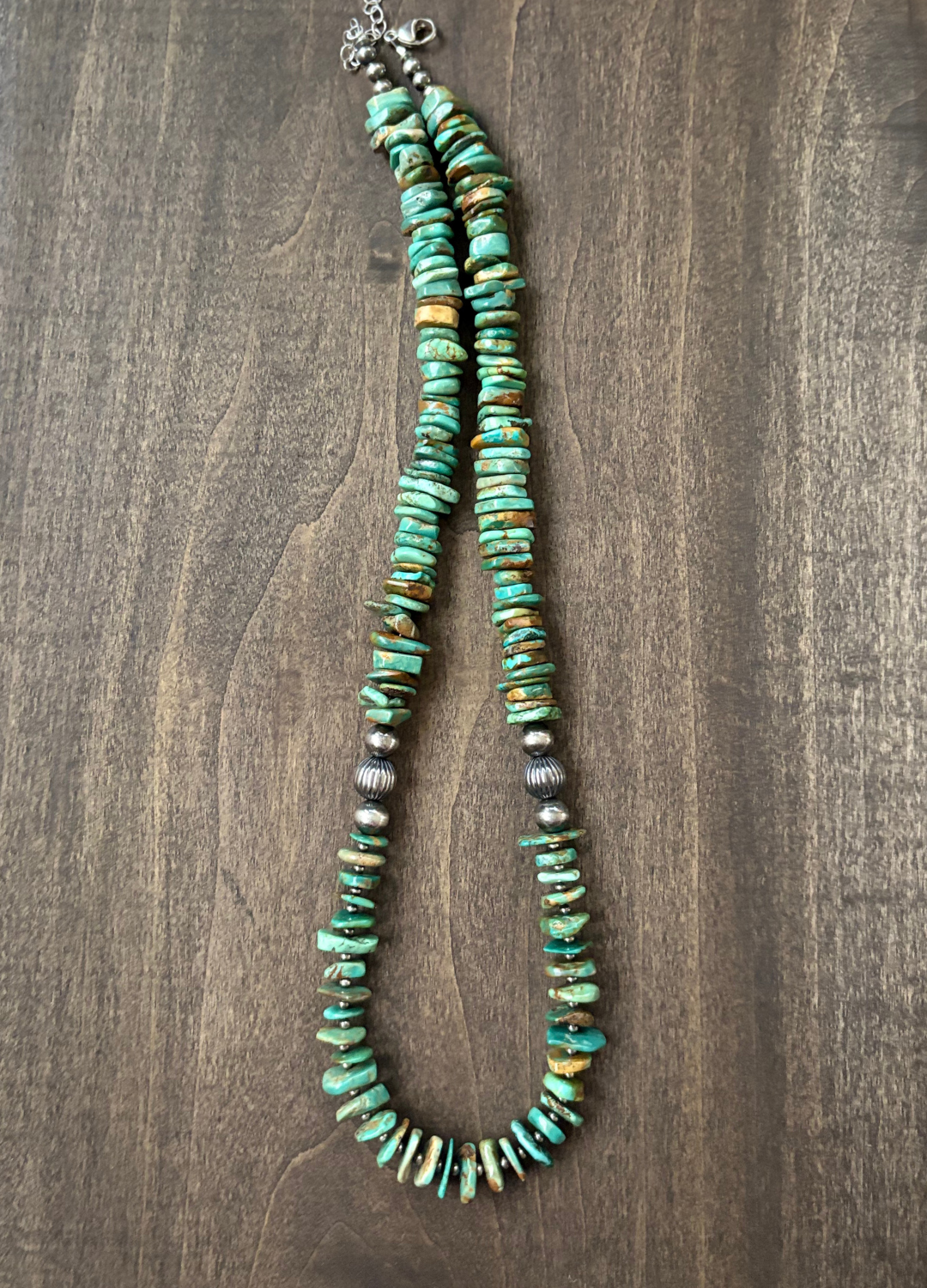 She is a stunner, these 13mm turquoise beads are beautiful, accented with 8mm and 10mm corrugated Navajo Pearls. 22” with a 2” extender