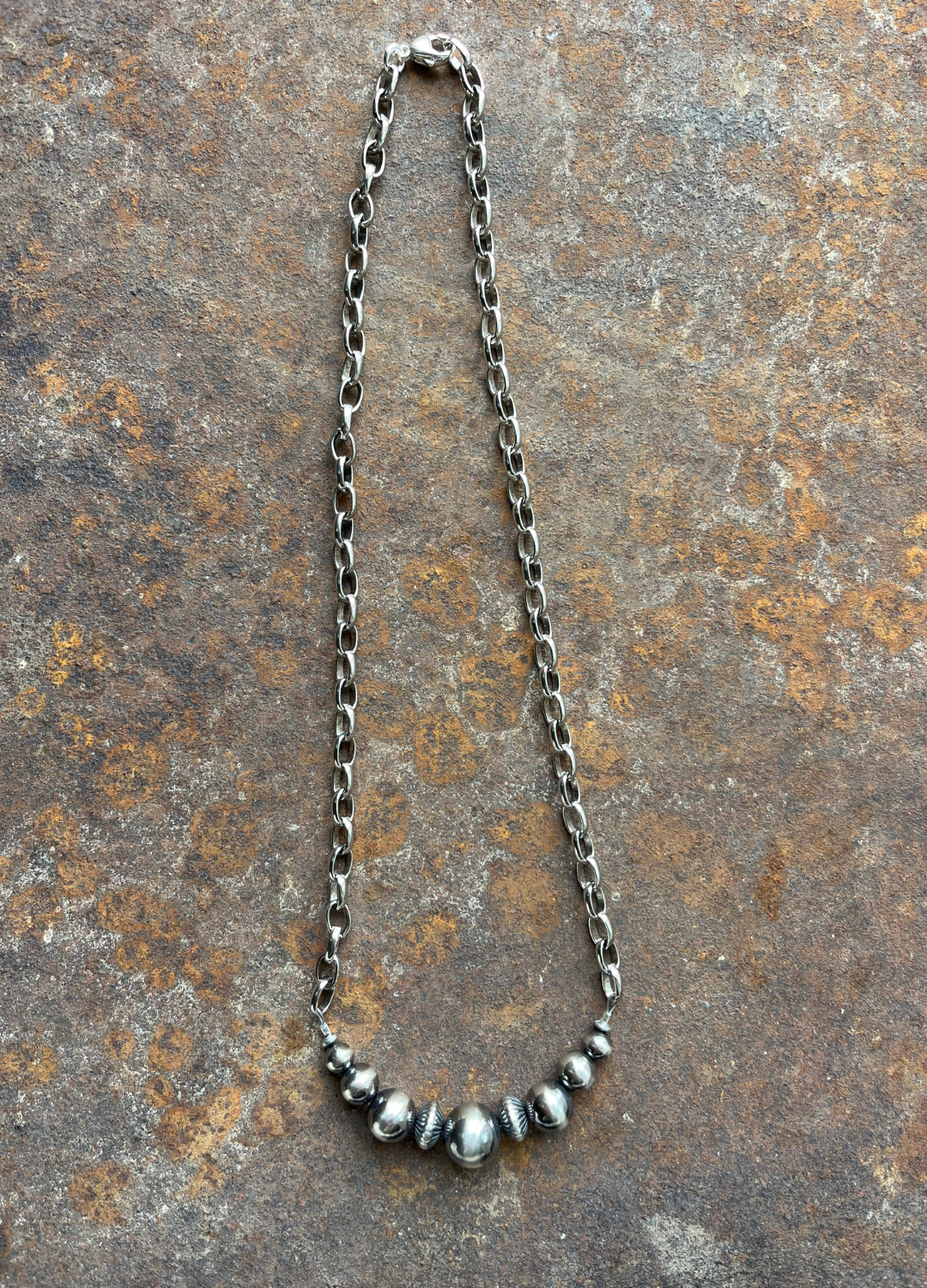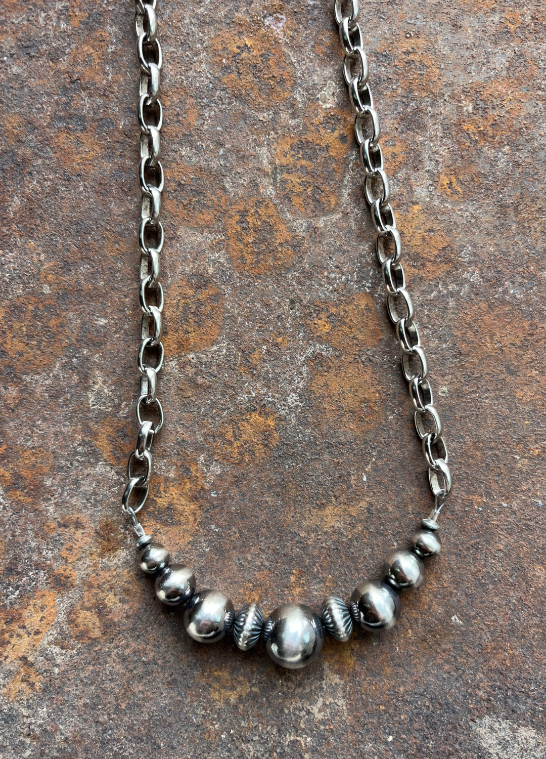 This bar necklace packs plenty of punch, detail, and texture. It graduates from 6mm to 12mm navajo pearls accented with 8mm corrugated saucer navajo pearls. Hangs at 16"