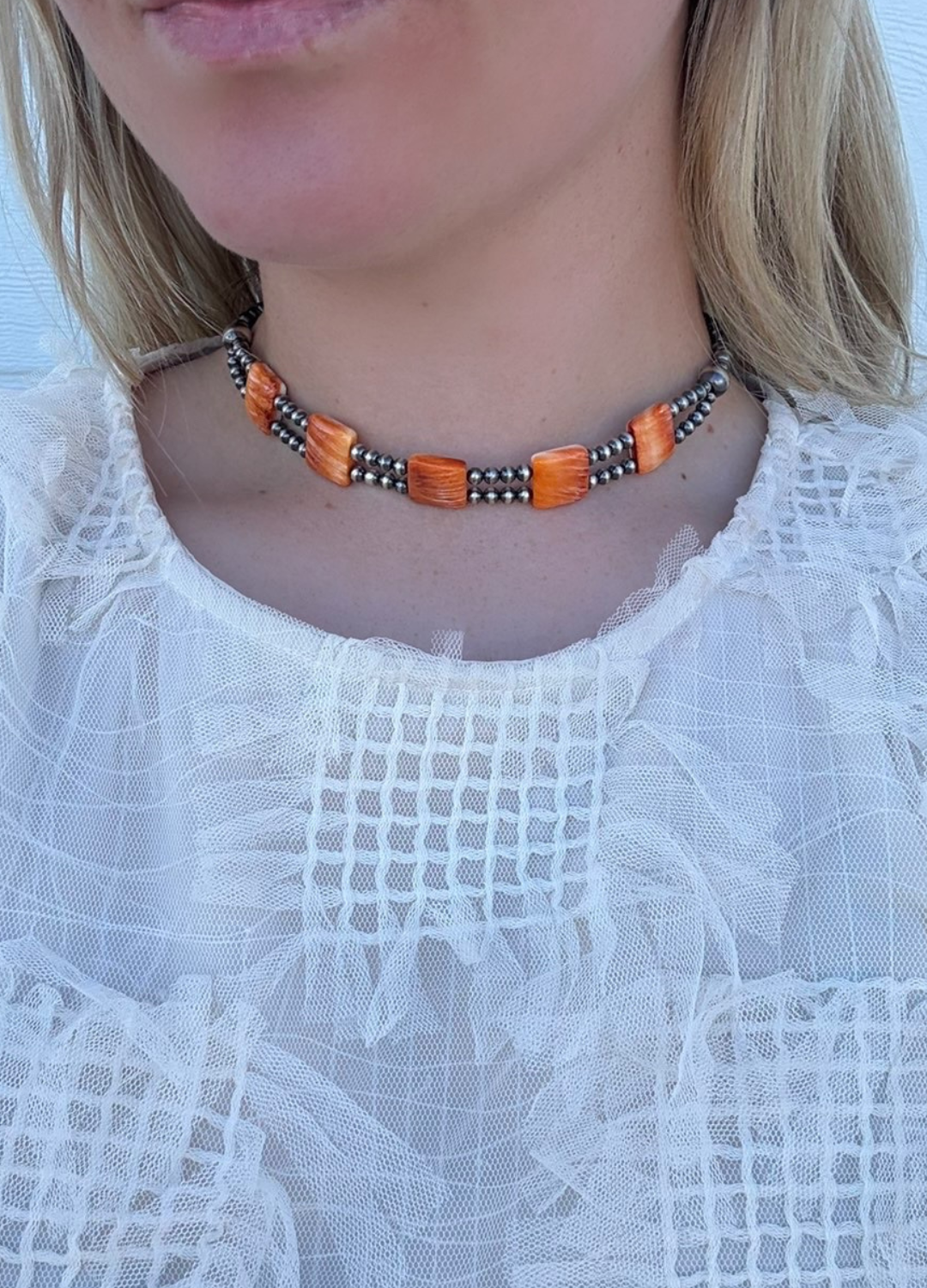 This piece is edgy and unique! Square orange spiny beads accented with 3mm, 4mm, 5mm, and 8mm navajo pearls. 13.5" with a 2" extender