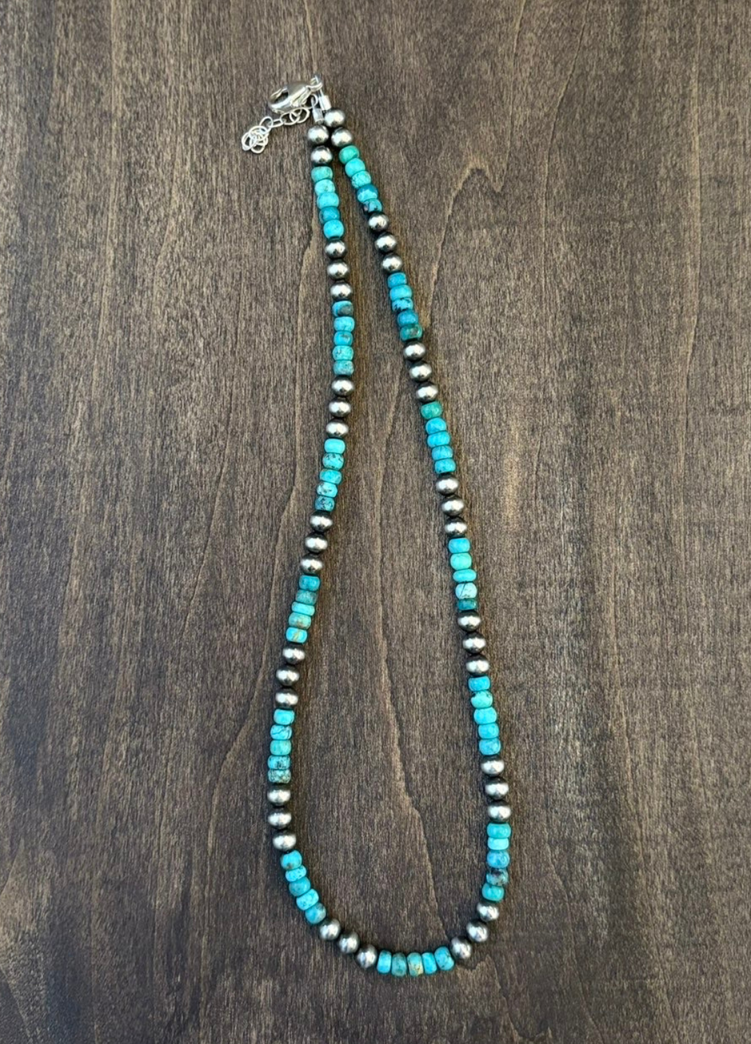 Blight blue 4mm turquoise beads accented with 5mm navajo pearls. 16" with a 2" extender