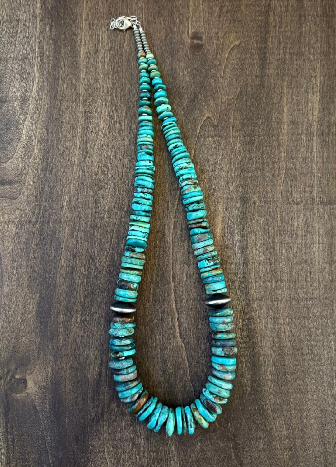 7mm to 19mm graduated turquoise with 14mm navajo pearl saucers. 20" with a 2" extender