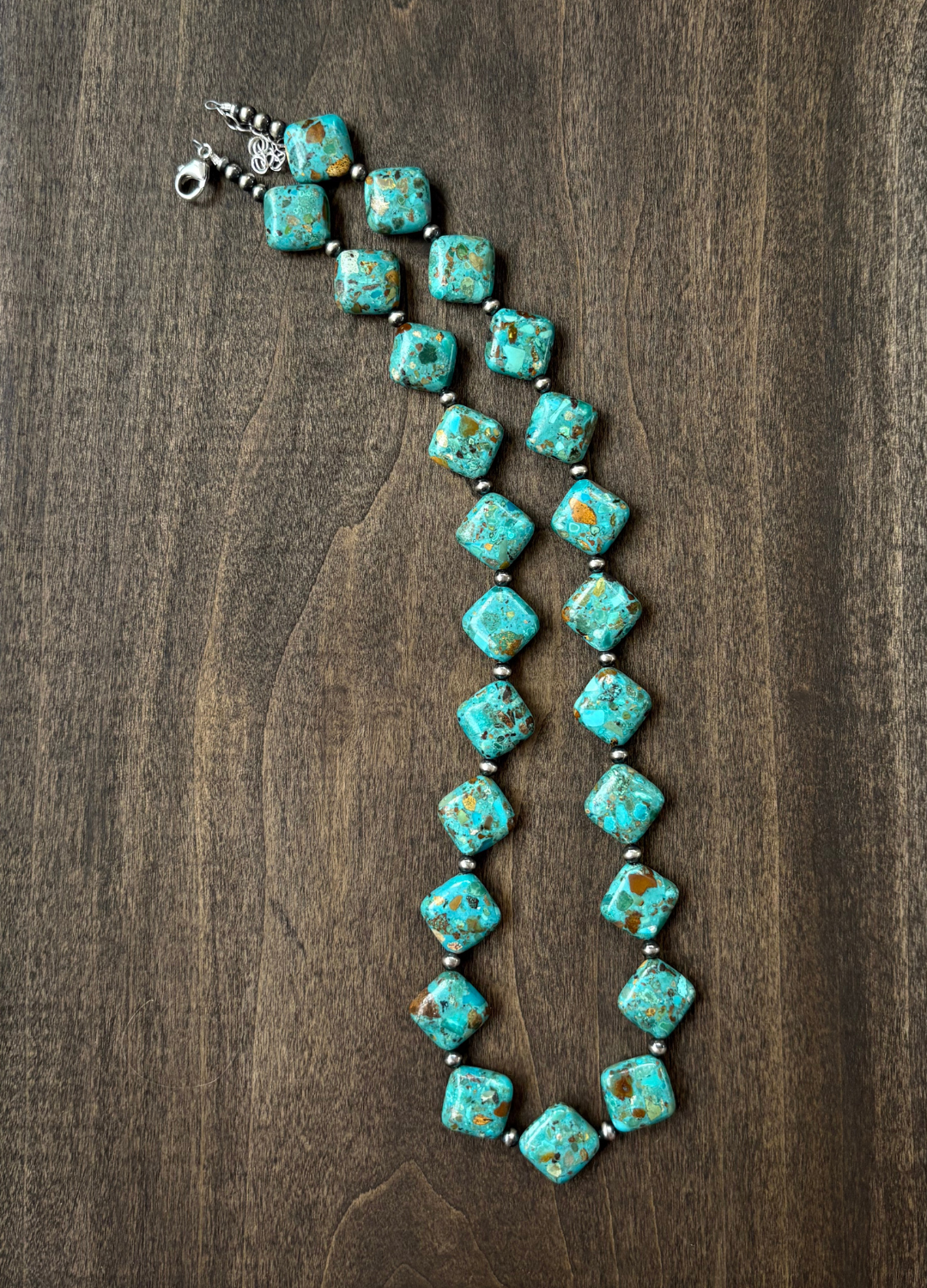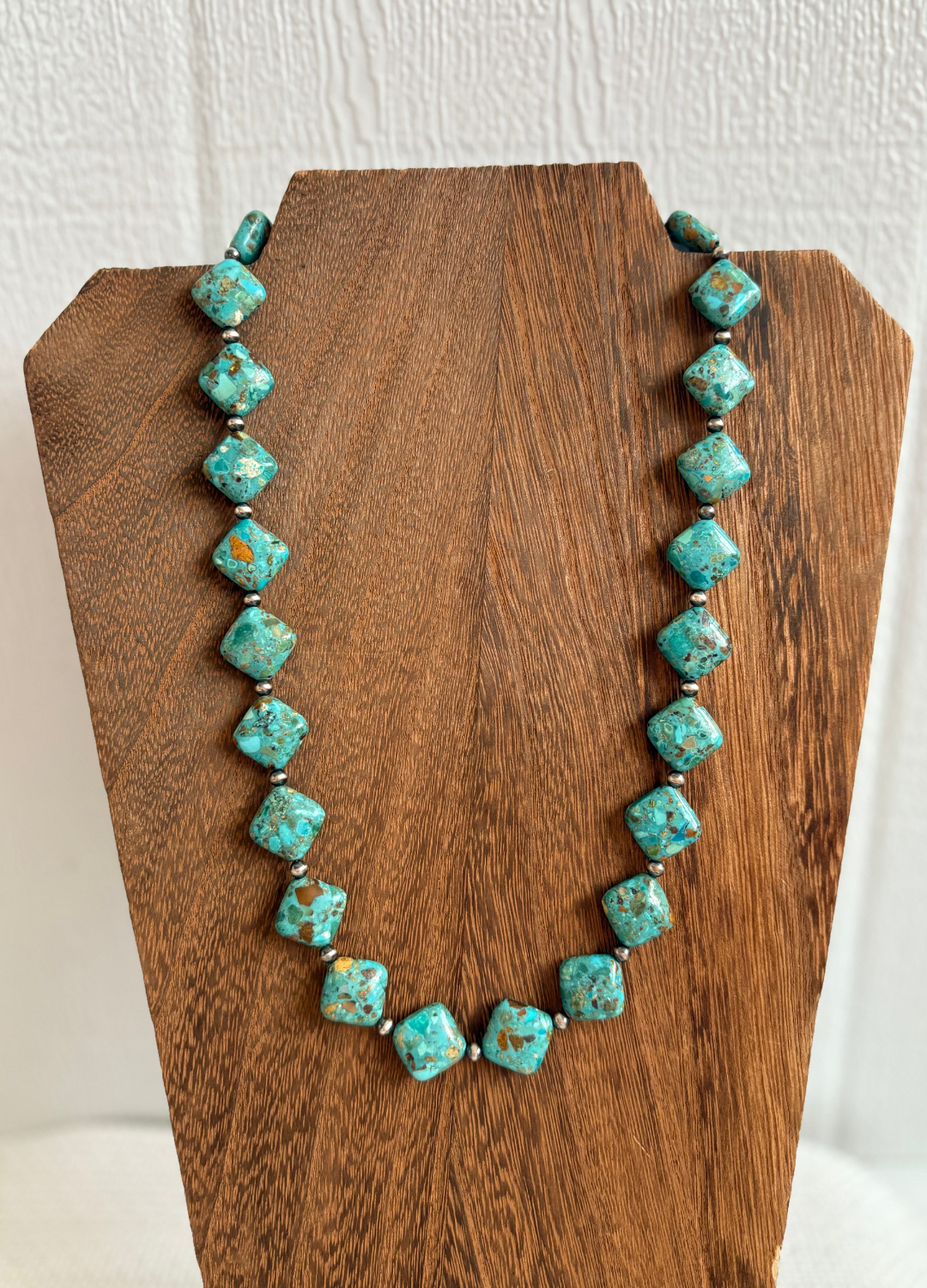 14mm diamond turquoise beads accented with 4mm Navajo Pearls. 20” with 2” a extender