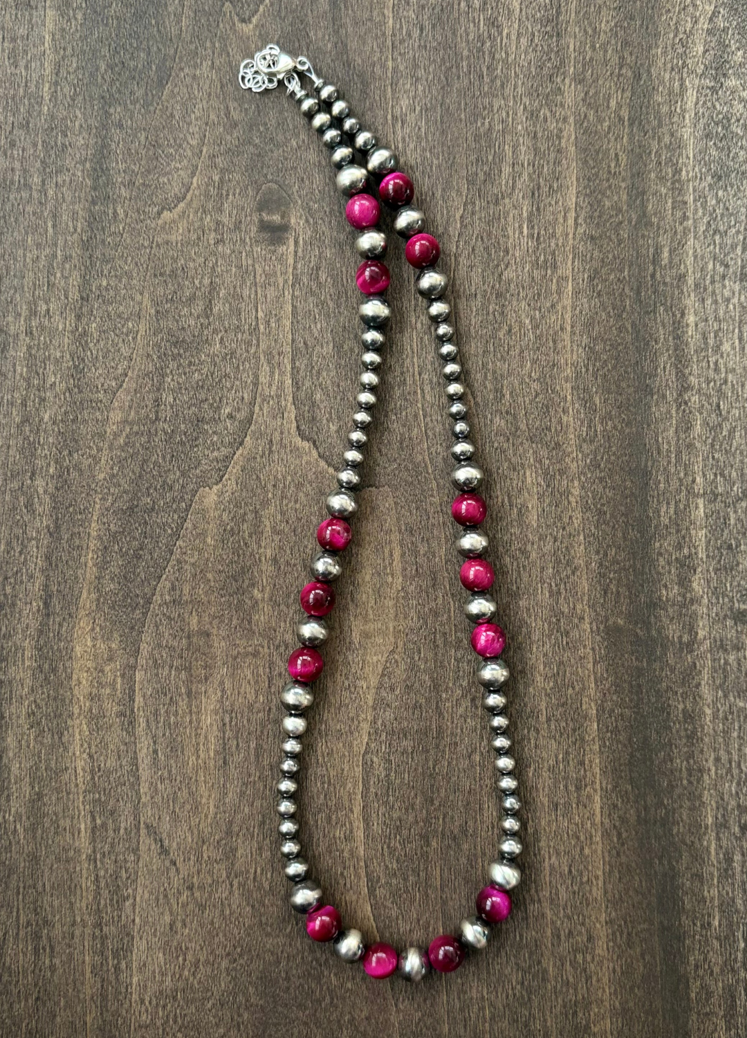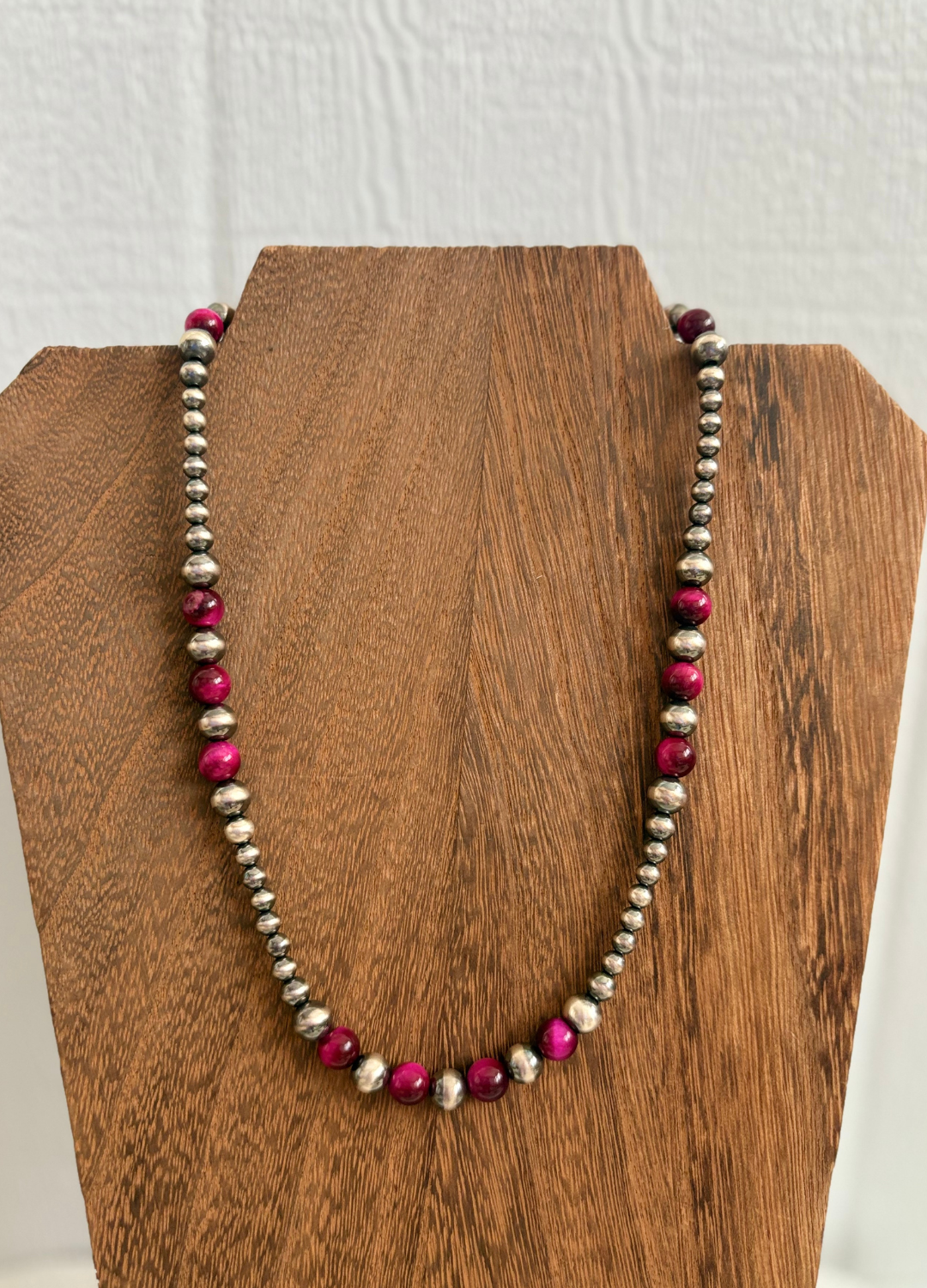 8mm Pink Tiger Eye paired with 5mm, 6mm and 8mm Navajo Pearls. 18” with 2” extender.