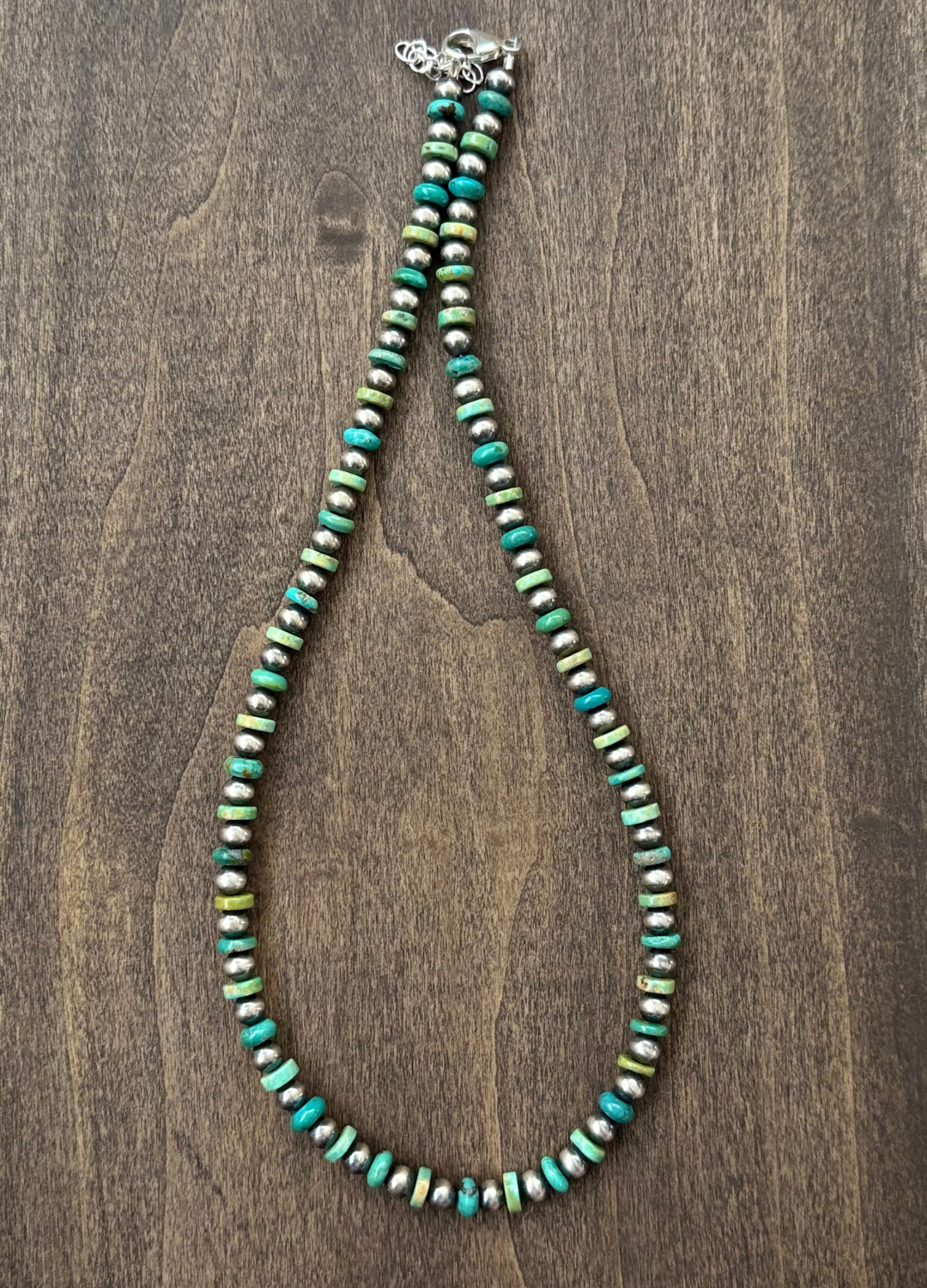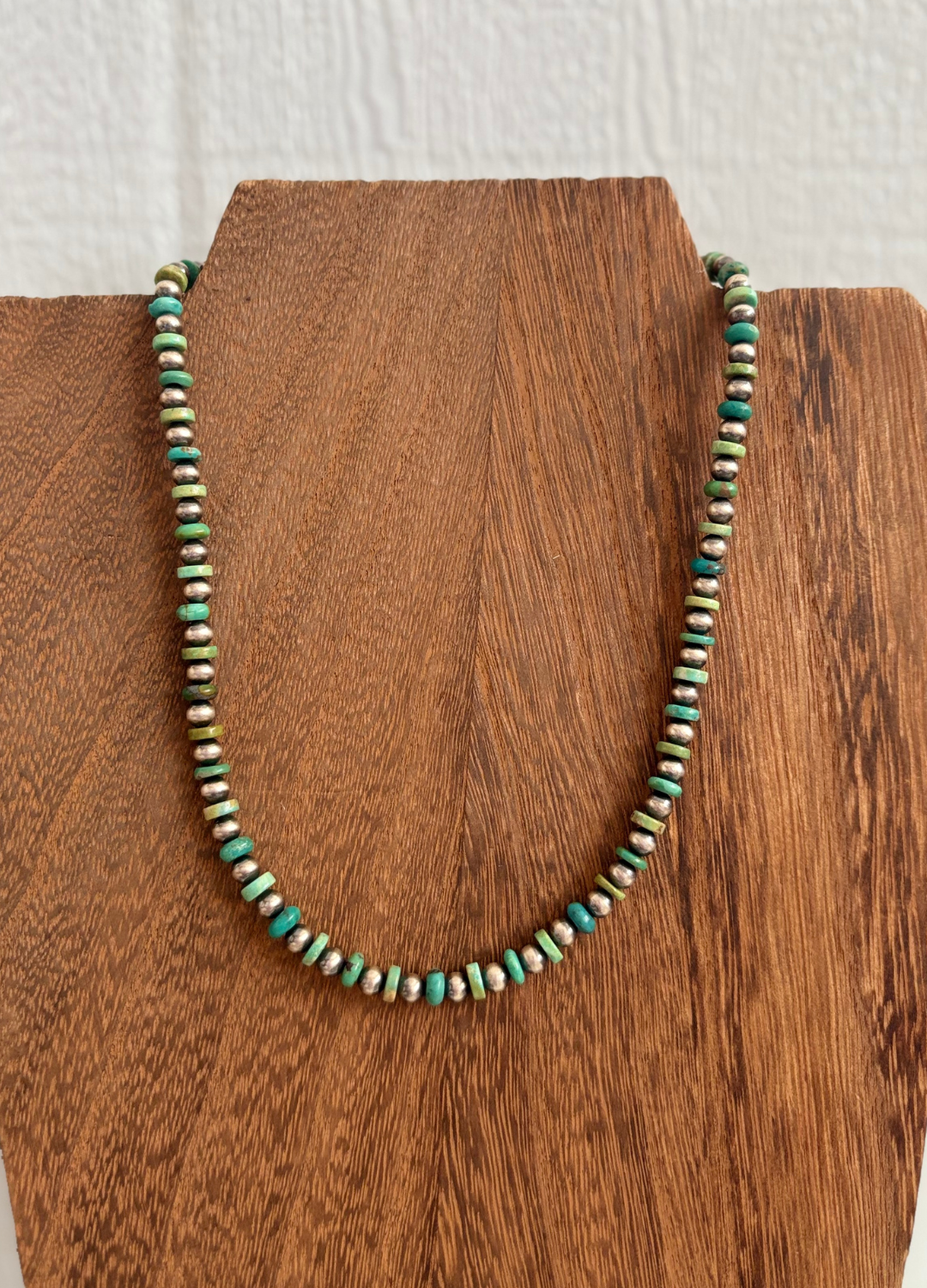 This piece is the perfect staple to add to a stack - turquoise heishi beads accented with 5mm Navajo Pearls. 16” with 2” extender.