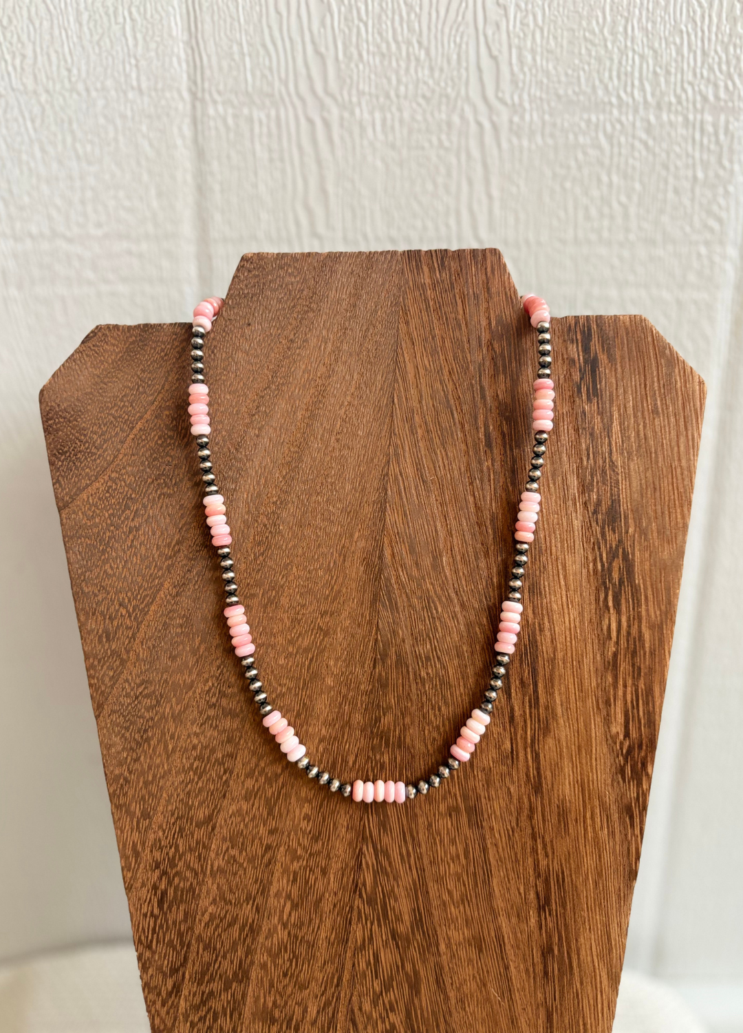 Beautiful 6mm Pink Conch beads accented with 4mm Navajo Pearls. 16” with 2” extender.