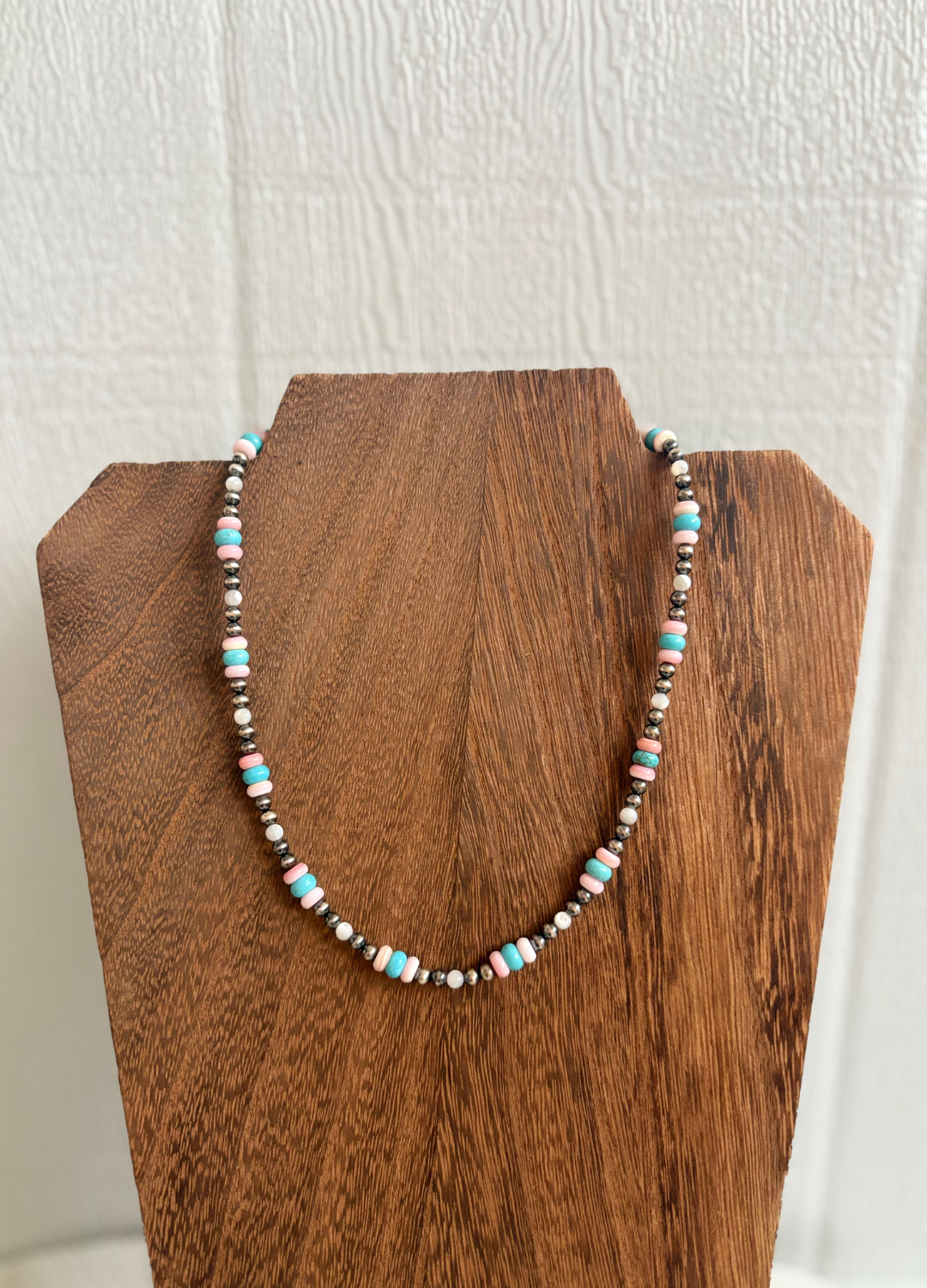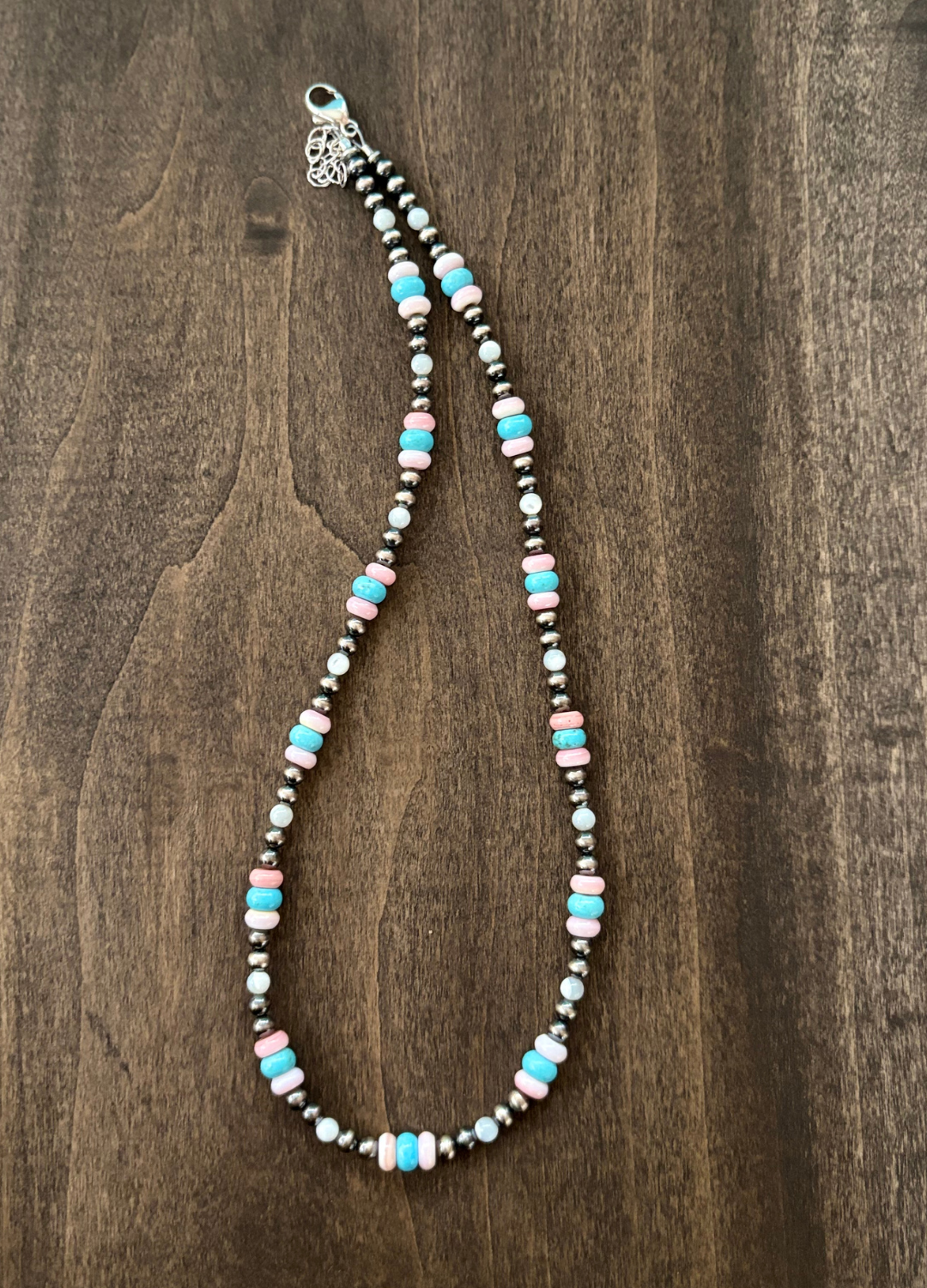 This one is so fun and versatile, the pairing of Pink Conch, Kingman Turquoise and Mother of Pearl paired with 4mm Navajo Pearls. 16” with 2” extender.