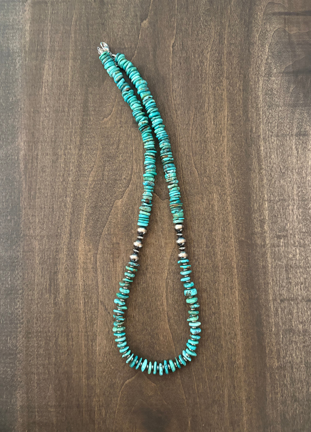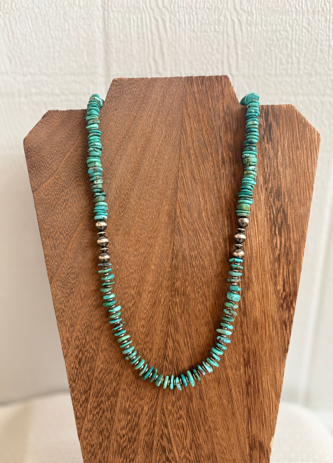 8mm turquoise beads accented with 8mm Navajo Pearls and Navajo Pearl saucers. Hangs at 22” with 2” extender.