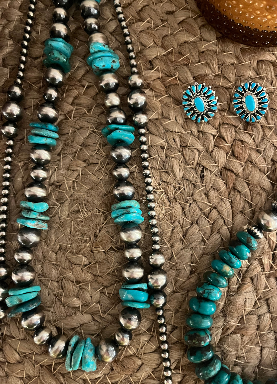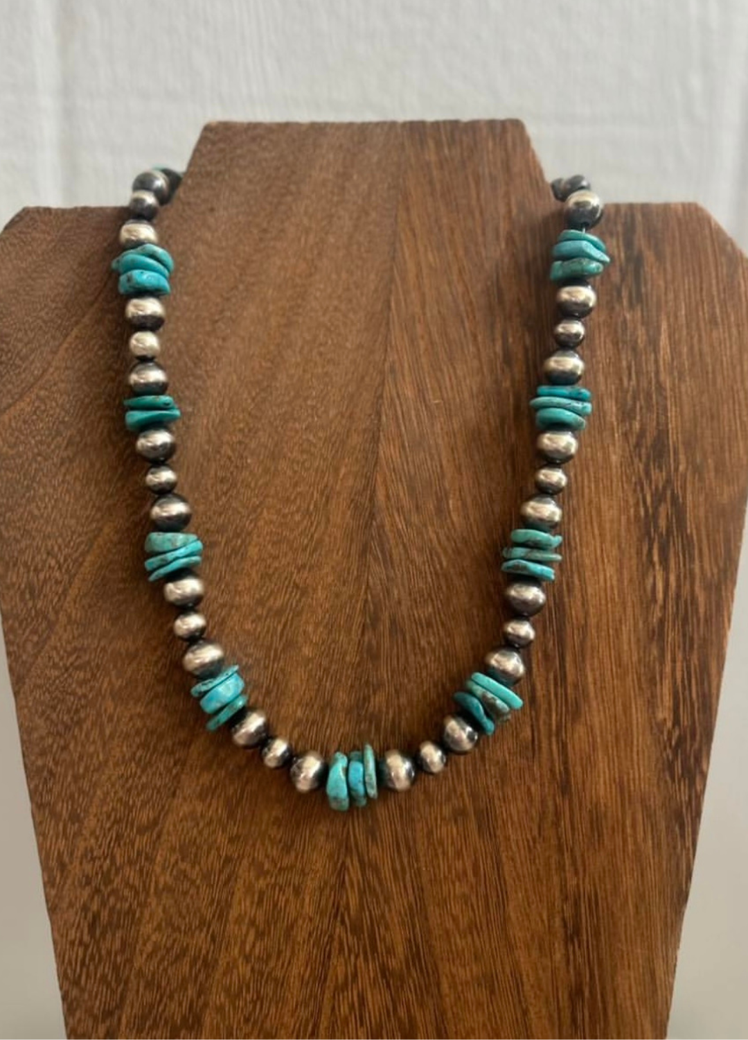 One thing that is true - this necklace is gorgeous. 10mm and 8mm navajo pearls combined with 14mm turquoise. 18" with a 2" extender