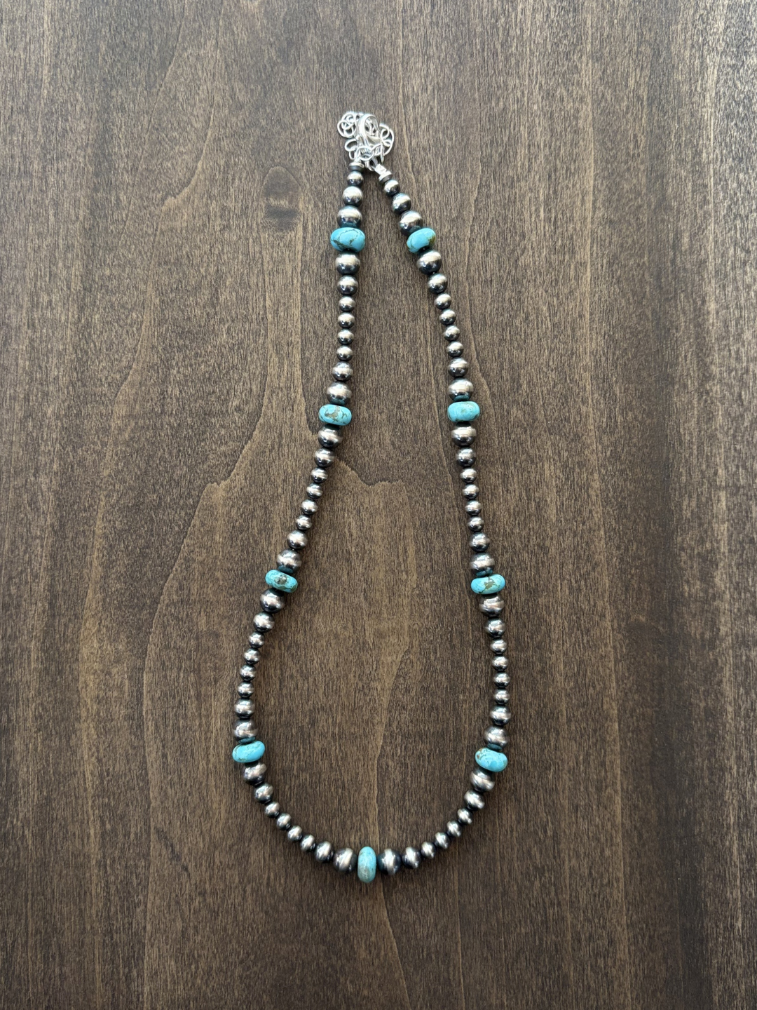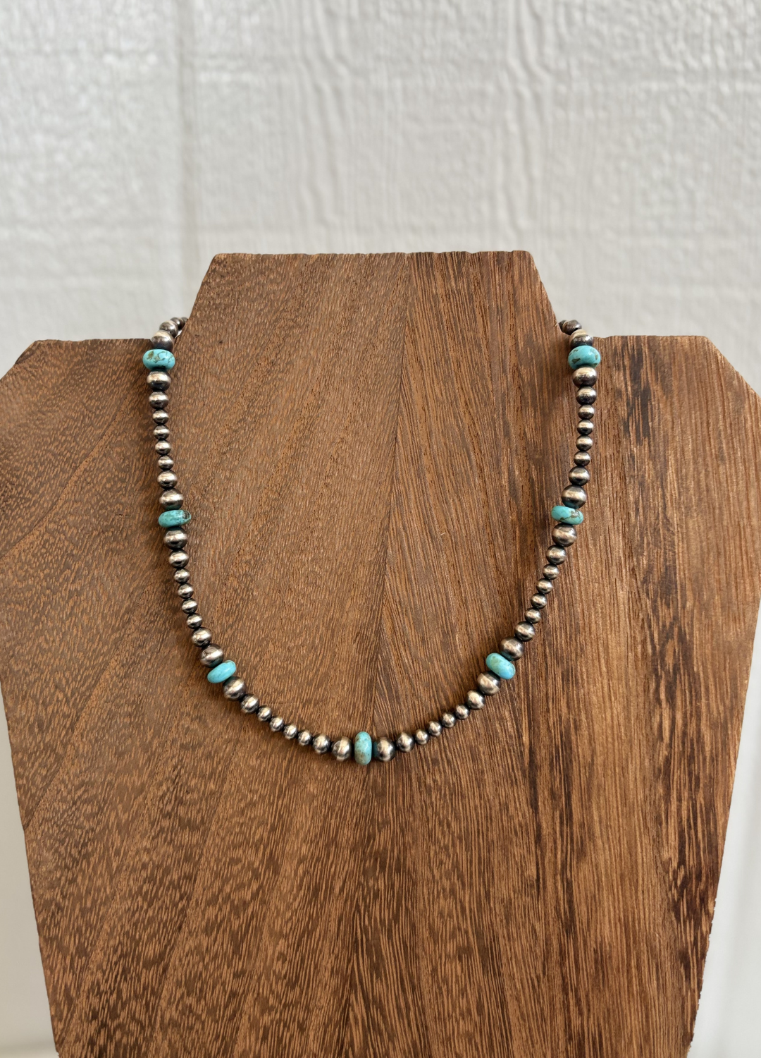 Perfect every day necklace! 4mm, 5mm and 6mm Navajo Pearls, accented with 8mm turquoise beads. 14” with 2” extender.