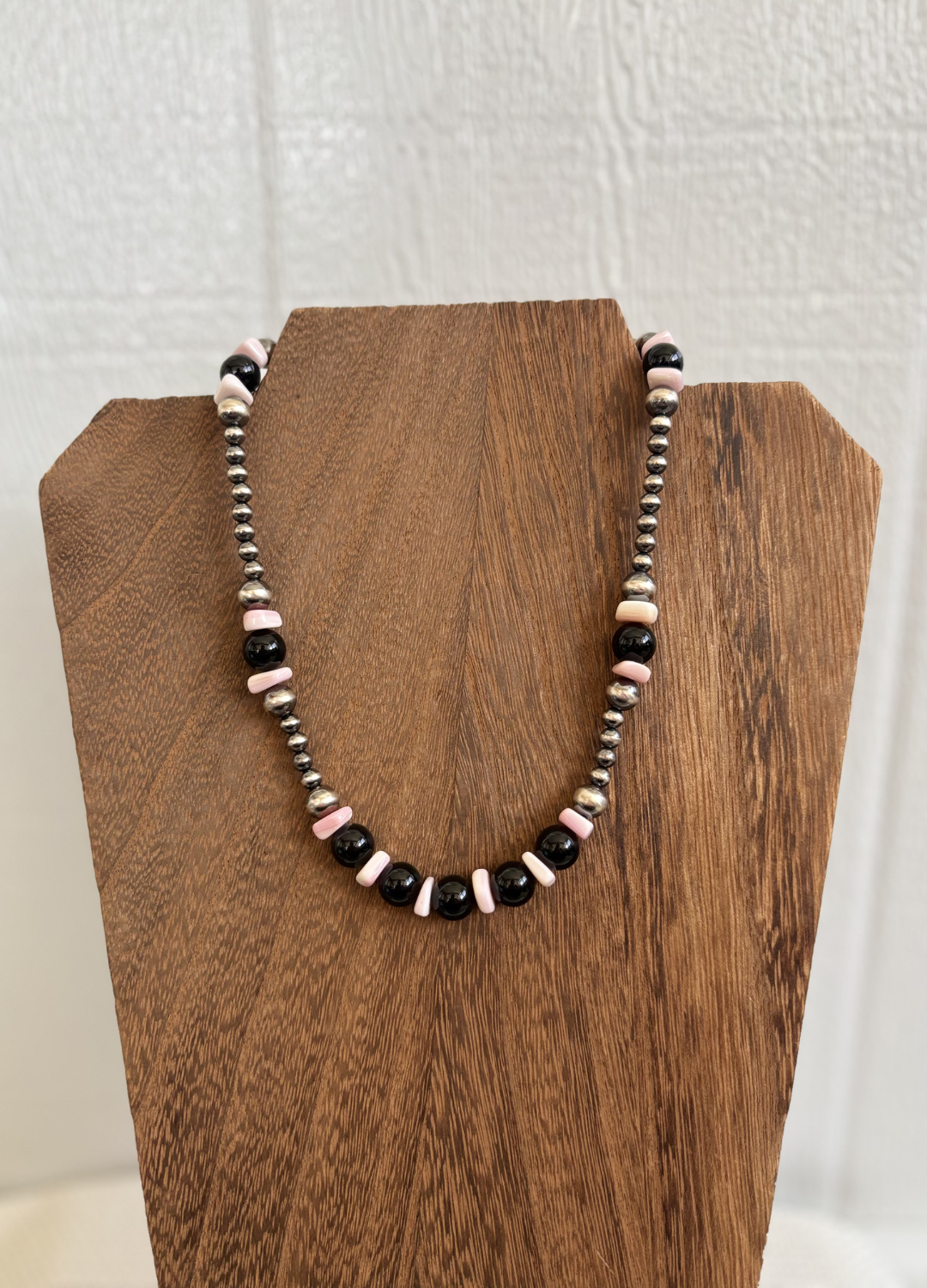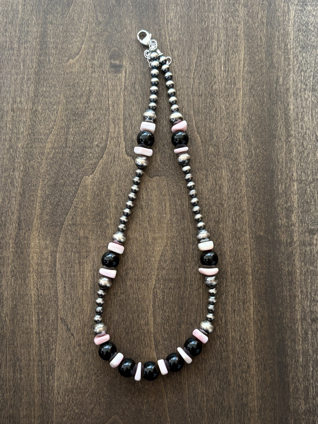 Pink Conch and Black Onyx makes for a killer combo, Pink Conch 8mm chip beads accented with 10mm round Black Onyx beads paired with 5mm and 8mm Navajo Pearls. 16” with 2” extender.